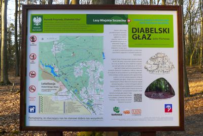 W słoneczne dni marca Stowarzyszenie Nasze Wycieczki zrealizowało prace polegające na oznaczeniu Diabelskiego Głazu w Lasach Miejskich Szczecina jako pomnika przyrody. Obok głazu zamontowano dębowy słupek z tabliczką „POMNIK PRZYRODY”, a konstrukcja pod tablice informacyjne i ławka zostały poddane konserwacji. Nowa tablica zawiera teraz większą mapę z zaznaczonymi wszystkimi pomnikami przyrody w okolicy Diabelskiego Głazu (stan na luty 2026 r.). Przy okazji zweryfikowaliśmy położenie stawów w Dolinie Siedmiu Młynów.