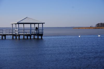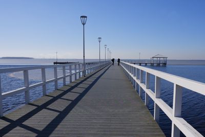 - Molo: Drewniane molo, na końcu którego znajduje się zadaszona altana. Molo ma około 160 metrów długości i jest na tyle szerokie, że spacerowicze mijają się na swobodne.