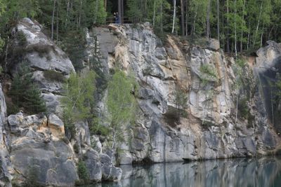 Jezioro Pískovna w Skalnym Mieście Adršpach w Czechach to sztuczny zbiornik po dawnej kopalni odkrywkowej piasku kwarcowego o wysokiej czystości wykorzystywanego do produkcji szkła optycznego i ołowiowego, zwanego szkłem kryształowym. Wokół jeziora jest szlak o długości około 1,5 km, oznaczony kolorem niebieskim. Po drodze jest kilka miejsc odpoczynku i punktów, z których można zobaczyć spokojną taflę jeziora i pływające w nim ryby sporych rozmiarów, fot. 01.05.2025, SNW