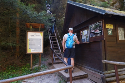 Trasa Adršpach - Teplice nad Metuji w Czechach. Rzeka Metuja przeciska się przez skalne szczeliny i tworzy Mały i Wielki Wodospad (Malý a Velký vodopád). Na zdjęciu wejście do jaskini, w której można zobaczyć Wielki Wodospad. Ma 15 metrów wysokości, a jego przepływ można "zwiększyć" na życzenie – flisacy u góry otwierają śluzę po okrzyku turystów: "Karkonoszu, daj nam wody!" lub "Rübezahl gib uns wasser" lub po czesku "Krakonoši, dej nám vodu". Nad Wielkim Wodospadem znajduje się Jezioro Adrszpaskie, fot. 01.05.2025, SNW