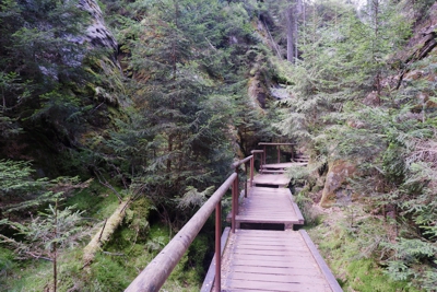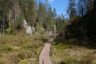Trasa Adršpach - Teplice nad Metuji w Czechach. W Wilczym Wąwozie ścieżka bywa błotnista nawet w suche dni. Jest też sporo drewnianych kładek i schodów, fot. 01.05.2025, SNW