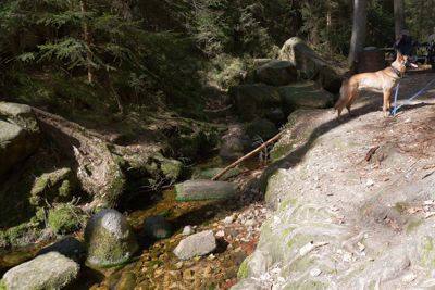 Trasa Adršpach - Teplice nad Metuji w Czechach. Skalny Potok, dopływ Metuji. Psy mogą przebywać tylko na smyczy, fot. 01.05.2025, SNW