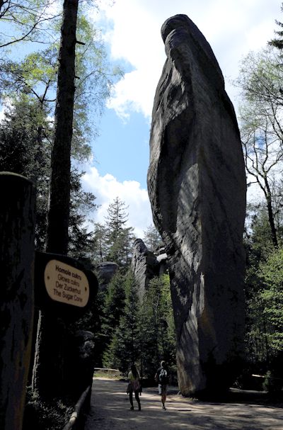 Skalne Miasto Adršpach w Czechach. Przy formacji skalnej Głowa Cukru (Homole cukru) pętla zielonego szlaku się rozwidla, można pójść w prawo i zobaczyć Mysią Dziurę, formacje skalne Starostę i Starościnę, Kochanków oraz punkt widokowy Wielką Panoramę, a następnie łącznikiem (szlak żółty) dojść przed Gotycką Bramą (Gotická brána). Można też skręcić w lewo i przejście pętli zielonego szlaku zostawić sobie na inny dzień, fot. 01.05.2025, SNW