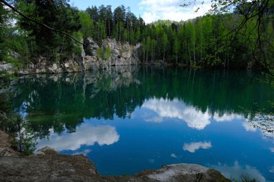 Jezioro Pískovna w Skalnym Mieście Adršpach w Czechach to sztuczny zbiornik po dawnej kopalni odkrywkowej piasku kwarcowego o wysokiej czystości wykorzystywanego do produkcji szkła optycznego i ołowiowego, zwanego szkłem kryształowym. Wokół jeziora jest szlak o długości około 1,5 km, oznaczony kolorem niebieskim. Po drodze jest kilka miejsc odpoczynku i punktów, z których można zobaczyć spokojną taflę jeziora i pływające w nim ryby sporych rozmiarów, fot. 01.05.2025, SNW