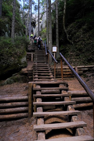 SCHODY: Na czas przejścia ma również wpływ ilość schodów, a jest ich w Skalnym Mieście ponad 2000 (kamienne, metalowe, drewniane). Suma podejść i ilość schodów na 7,5 km trasie = wysiłek na dystansie 12 km w terenie płaskim. Największe spiętrzenie stopni jest w Wilczym Wąwozie, zielonym szlaku przy Wielkiej Panoramie i podejściu pod Adrszpaskie jeziorko.