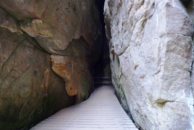 Trasa Adršpach - Teplice nad Metuji w Czechach. Rzeka Metuja przeciska się przez skalne szczeliny i tworzy Mały i Wielki Wodospad (Malý a Velký vodopád). Na zdjęciu wejście do jaskini, w której można zobaczyć Wielki Wodospad. Ma 15 metrów wysokości, a jego przepływ można "zwiększyć" na życzenie – flisacy u góry otwierają śluzę po okrzyku turystów: "Karkonoszu, daj nam wody!" lub "Rübezahl gib uns wasser" lub po czesku "Krakonoši, dej nám vodu". Nad Wielkim Wodospadem znajduje się Jezioro Adrszpaskie, fot. 01.05.2025, SNW