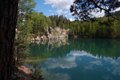 Jezioro Pískovna to sztuczny zbiornik po dawnej piaskowni tuż przy wejściu do Skalnego Miasta w Adršpachu. Wokół jeziora jest szlak o długości około 1,5 km, oznaczony kolorem niebieskim. Po drodze jest kilka miejsc odpoczynku i punktów, z których można zobaczyć spokojną taflę jeziora i pływające w nim ryby sporych rozmiarów, fot. 01.05.2025, SNW